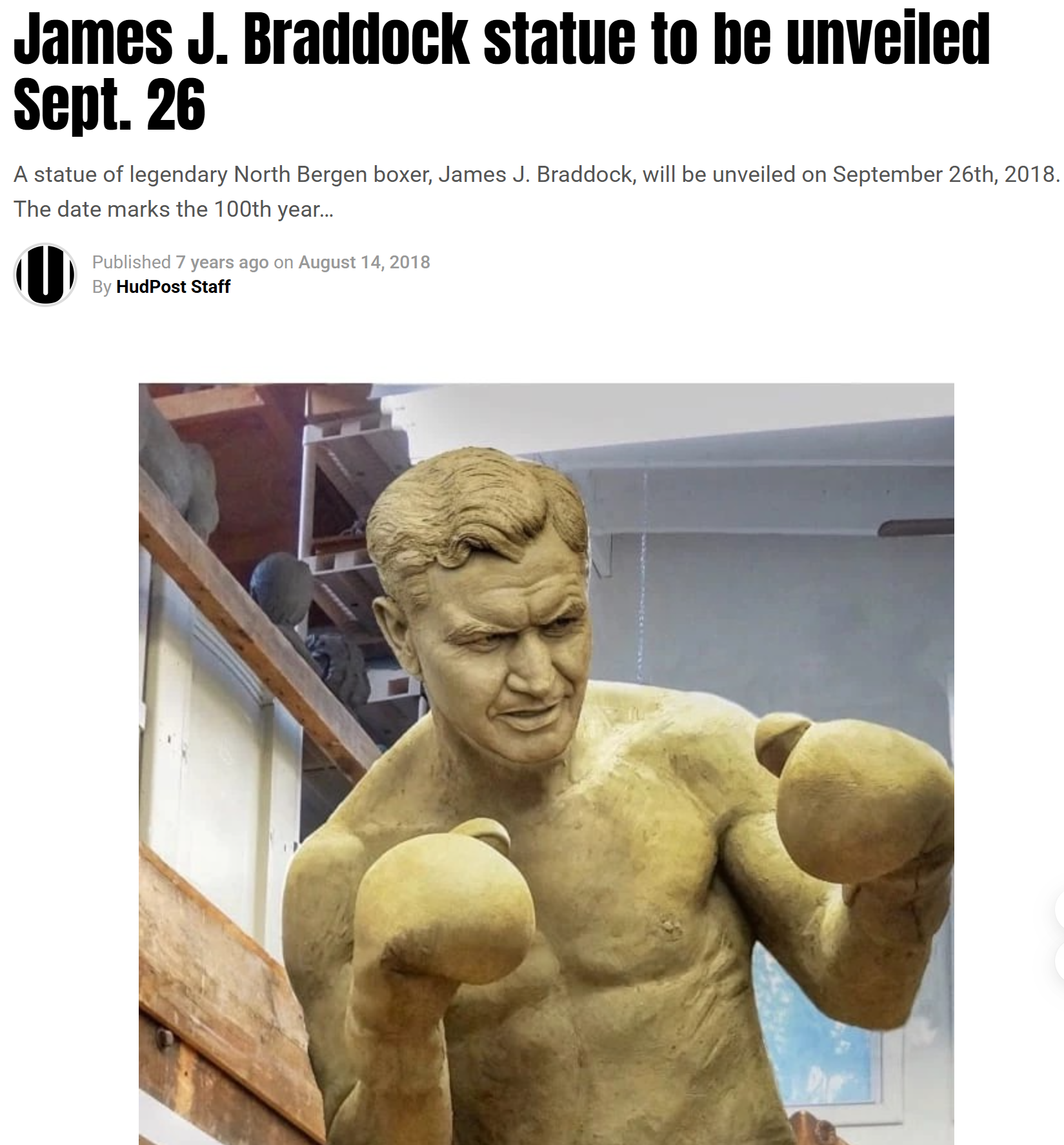 — A statue of legendary North Bergen boxer, James J. Braddock, will be unveiled on September 26th, 2018. The date marks the 100th year anniversary of the North Hudson county park.