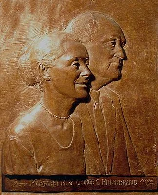 Relief sculpture of Mr. and Mrs. Hillenbrand by Zenos Frudakis.